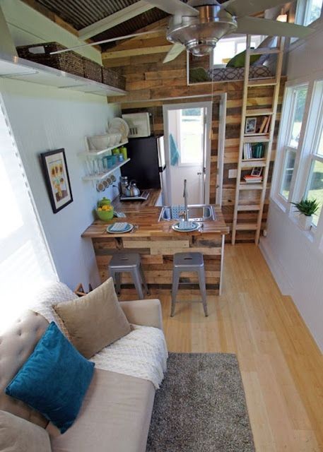 | Mẫu 9 Dùng hai màu chủ đạo là trắng và màu gỗ. Góc bếp ngăn nắp với bàn ăn nhỏ xinh. Trên gác là chỗ ngủ khá lí tưởng. Thêm thắt vài bức tranh nhỏ treo trên tường. | Mẫu 10 Xây nhà cấp 4 mang phong cách trẻ trung, hiện đại. Bộ sofa và bàn trà đơn giản kết hợp với tấm thảm cỡ trung màu xanh. Nền sàn màu gỗ sậm tương phản với tường trắng. |