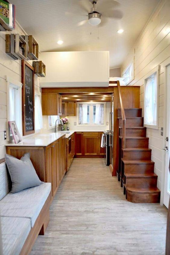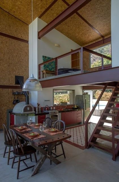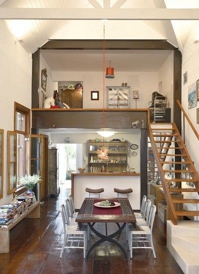 | Mẫu 15 Thiết kế nhà cấp 4 với cầu thang được độc và lạ. Dãy bàn dài vừa làm bàn ăn, bàn làm việc. Bếp bố trí cuối phòng. Thêm vài chùm đèn vàng. Chỗ ngủ khá tiện nghi bên trên gác. | Mẫu 16 Nhà đẹp cấp 4 với kệ bếp khá rộng rãi bên dưới gác. Màu chủ đạo của căn nhà là màu trắng và xám. Nội thất bằng gỗ đơn giản nhưng sang trọng. Cách điệu vài ô trang trí trên tường. |