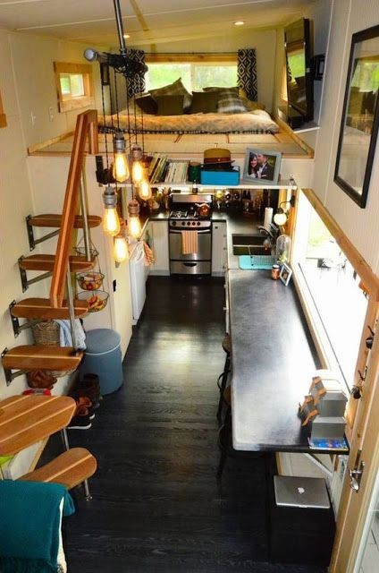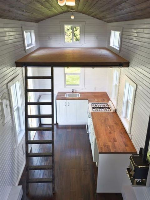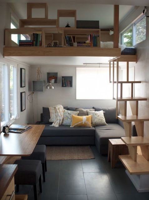 | Mẫu 13 Từ cầu thang, bàn ghế đến kệ bếp thiết kế cực kì đơn giản. Giường ngủ trên gác và khung cửa sổ lớn giúp không khí trong nhà thoáng đãng hơn. | Mẫu 14 Cầu thang được cách điệu làm kệ sách. Bàn làm việc và ghế sofa được bố trí gọn gàng. Trên gác kê nệm để làm phòng ngủ. Tận dụng tối đa những khung cửa sổ. |