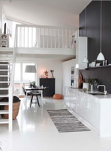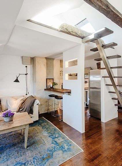 | Mẫu 5 Chỗ ngủ rất ấm áp bên trên gác. Cầu thang và nền giả gỗ phối cùng tông màu sơn trắng. Bàn ăn cho hai người được thiết kế nhỏ gọn. Bếp và phòng tắm bên dưới gác. | Mẫu 6 Với nền trắng và sơn tường màu trắng. Bàn ăn cũng là bàn làm việc bố trí gọn gàng dưới chân cầu thang. Bộ sofa nằm bên góc phải. Nhấn nhá thêm vài bức tranh treo tường. |